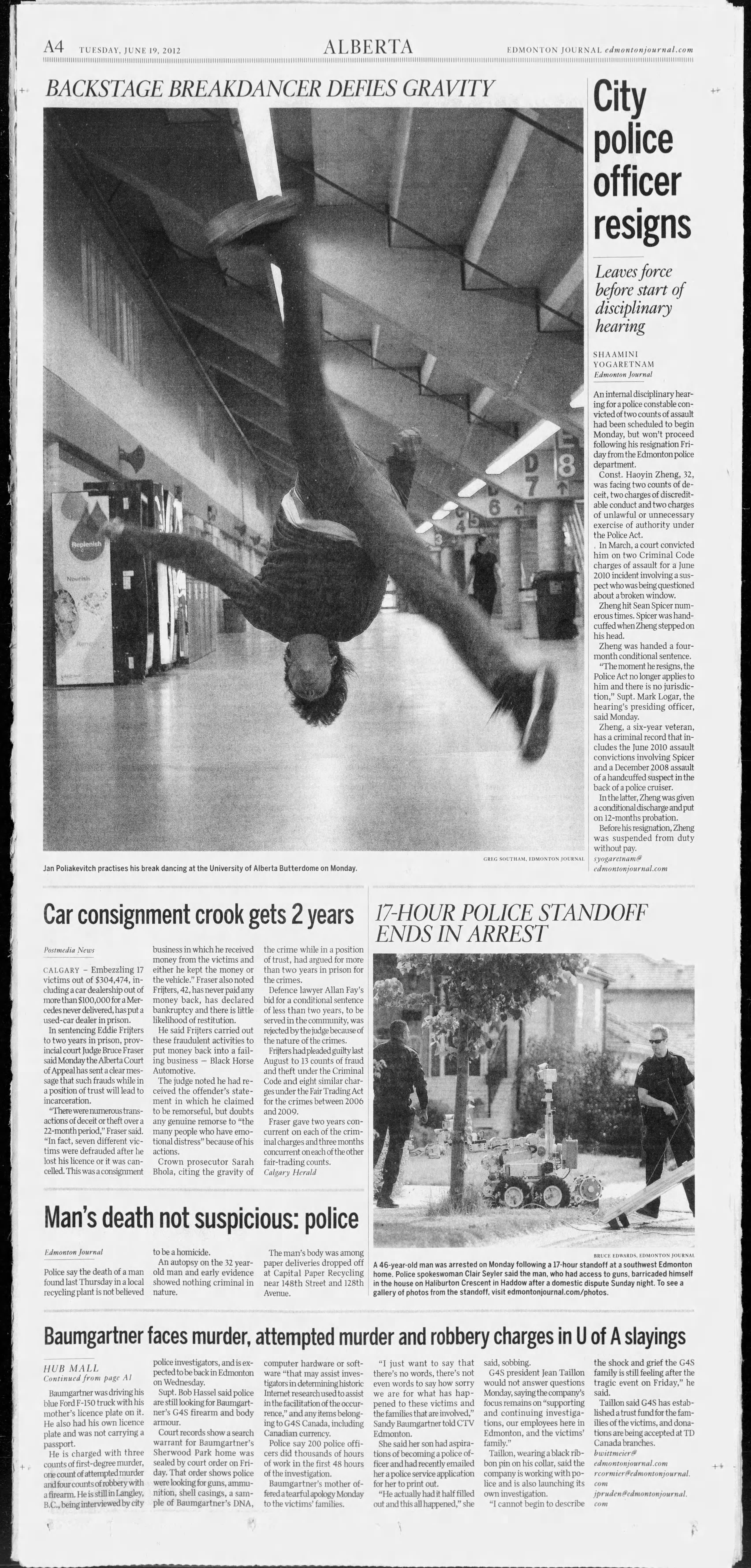 In the early morning of December 15, 2008, Lauchlin Torry and Jean-Marc Viau were pulled over by Constable Haoyin Zheng during a vehicle stop near 145 Street and 104 Avenue. Torry and Viau were ordered out of the truck, which was later found to have been stolen. Police searched the men and found a piece of a coat hanger in Torrys back pocket. While being handcuffed and put into the back of the police car, Torry and Viau report that they were beaten by Zheng.