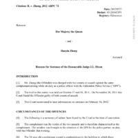Zheng was charged with two counts of assault and one count of assault with a weapon in the alleged beating of Lauchlin Torry and Jean-Marc Viau. The judge ruled that Zheng used excessive force against Viau and he was found guilty of assault, receiving a conditional discharge, 12 months probation, and restriction to administrative duties. Zheng would later be convicted of another assault charge in an on-duty incident from 2010 and would resign from the Edmonton Police Service.